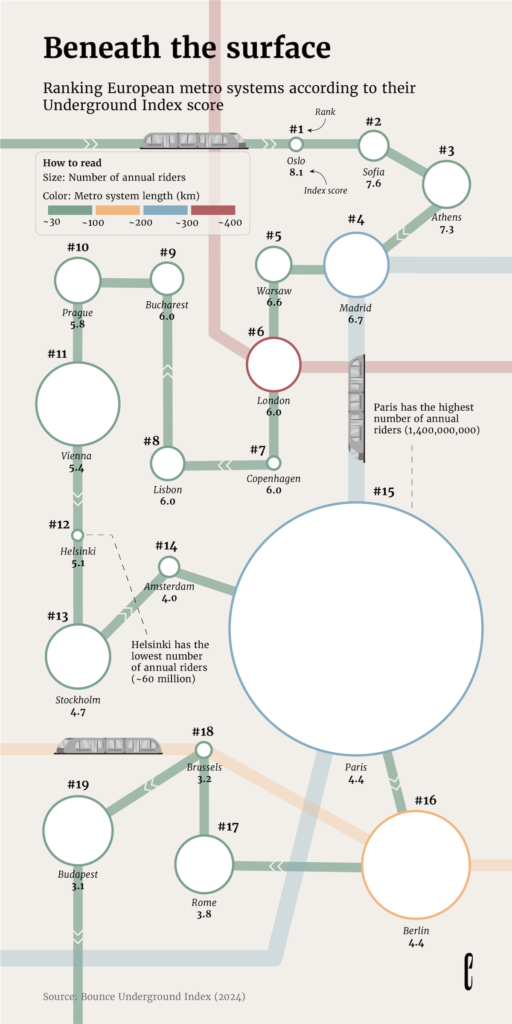 W dzisiejszej reVIZji omówię pracę Mandy Spaltman (Jej strona) dla The European Correspondent, będącą podsumowaniem rankingu Bounce Underground System (Tu link), czyli zestawienia oceniającego systemy metra w Europie.