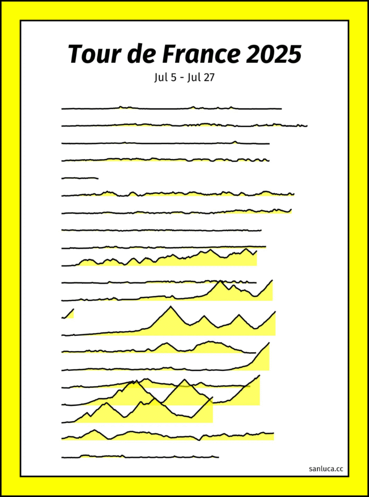 Fani kolarstwa prawdopodobnie zawiedzeni są raczej płaskim profilem pierwszych dziesięciu etapów. Fani Joy Division widzą tu jakąś wariację na temat okładki Unknown Pleasures, natomiast fani wizualizacji danych będą mieli lepszy dzień, bo to świetny ridgeline plot. Minimalistyczna vizka pokazuje w ciekawy sposób profile kolejnych etapów najsłynniejszego kolarskiego Touru – na osi x mamy długość etapu, a na osi y wysokość n.p.m. To, co zwraca uwagę, to nakładające się wykresy, widoczne zwłaszcza w górskich etapach. Jest to celowy zabieg, który pozwala na bezpośrednie porównanie sąsiadujących ze sobą serii. Dodatkowo warto zwrócić uwagę na bardzo sprytny zabieg, polegający na zastosowaniu wykresów powierzchniowych zamiast tradycyjnie stosowanych w tym przypadku wykresów liniowych. Dzięki temu podkreślone zostały etapy o większej amplitudzie wzniesień. Zastosowany kolor ma znaczenie czysto estetyczne dla czytelności wykresu, niemniej jednak fani kolarstwa bezbłędnie skojarzą go z żółtą koszulką lidera klasyfikacji generalnej Touru. Podobny zabieg autor zastosował w innych pracach pokazujących dane dla Giro d’Italia i Vuelta a España.
