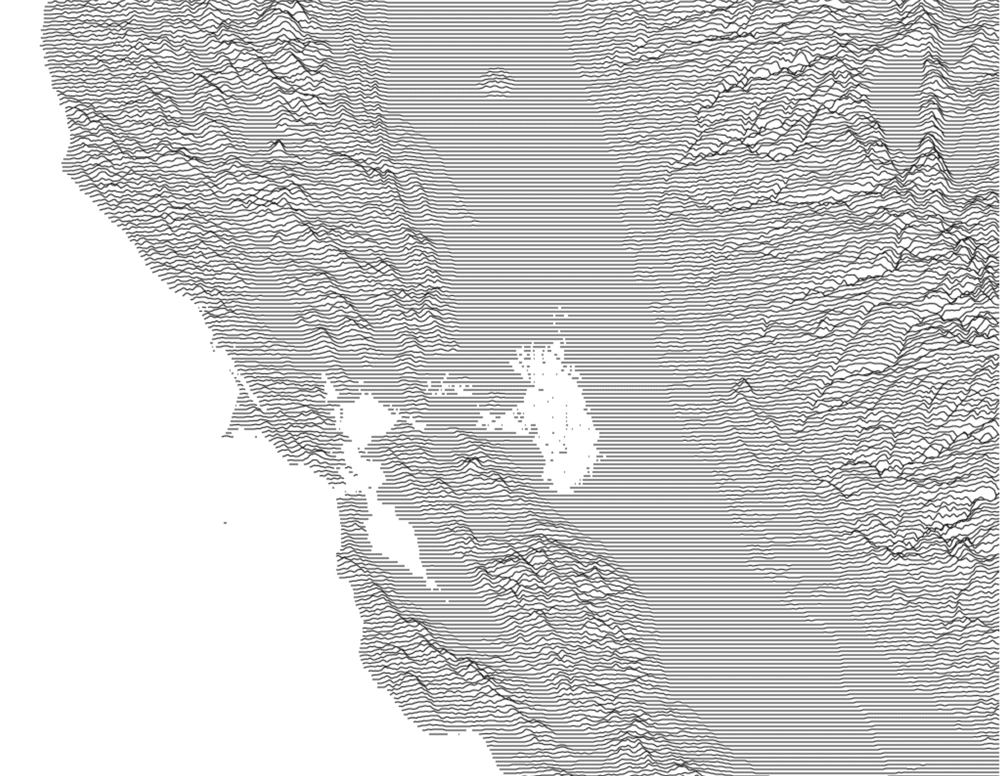 Odmiennym tematem jest zastosowanie ridgeline plotów w kartografii. Traktując oś x wykresu jako długość, a oś y jako szerokość geograficzną, można łatwo pokazać różne zjawiska geograficzne za pomocą „wysokości” linii. Przy odpowiednim zagęszczeniu serii można uzyskać ciekawe efekty, wiernie oddające stan faktyczny, np. rzeźbę terenu zatoki San Francisco jak poniżej.