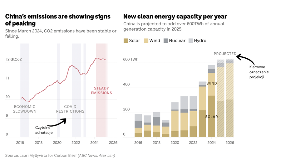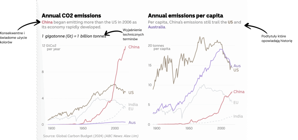 Bardzo interesujące rozwiązanie zostało zastosowane na wykresie pokazującym historyczne poziomy emisji CO2. Dzięki dyskretnym adnotacjom łatwiej jest zrozumieć skąd brały się spadki emisji w przeszłość i skonfrontować to z widocznym obecnie wypłaszczeniem wykresu.