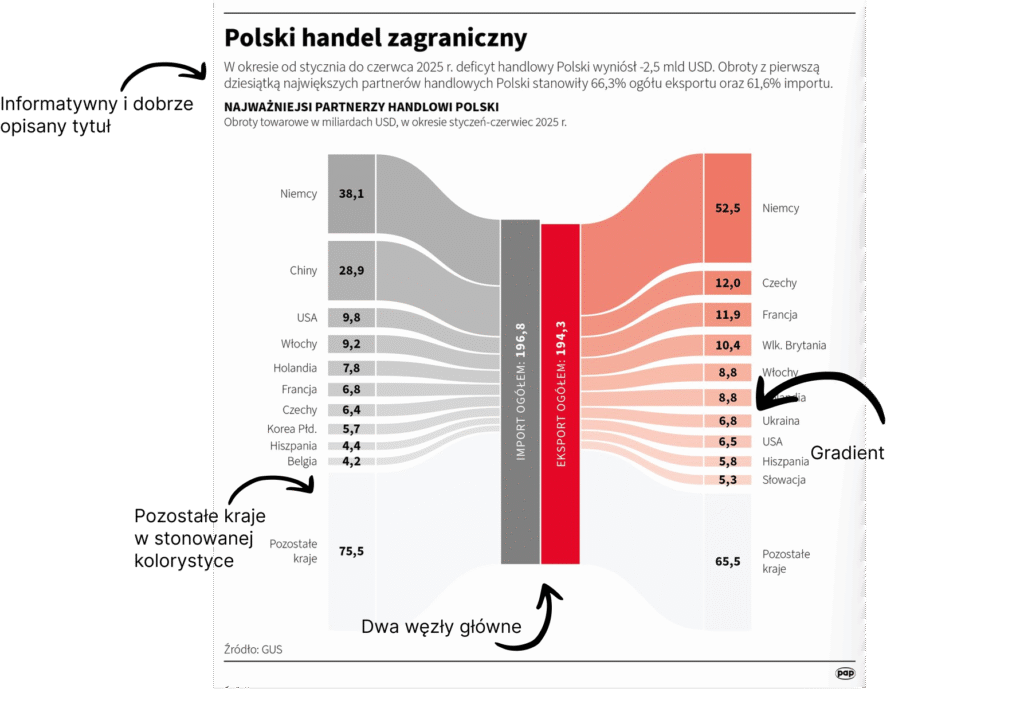 Omawiany wykres jest bardzo dobrze wykonany: 1. Jakościowy tytuł, 2. Zastosowanie gradientu kolorów, który pozwala na szybsze wartościowanie, 3. Kategoria „Pozostałe kraje” jest w stonowanej kolorystyce – nie odwraca uwagi od głównego przekazu, 4. Wykres Sankeya to atrakcyjna, przykuwająca uwagę wizualizacja.