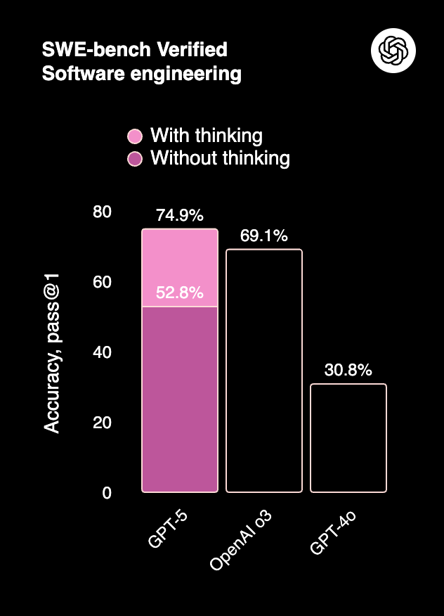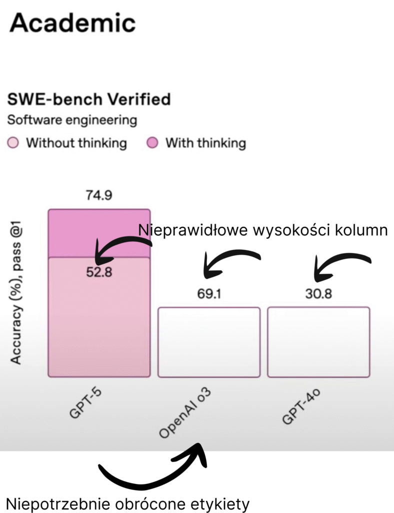 O ile etykiety można uznać za kwestię estetyczną, czy funkcjonalną, to wysokość kolumn jest poważnym błędem, żeby nie napisać manipulacją. Kolumna z wartościami dla GPT-5 jest nieproporcjonalnie wyższa od pozostałych kolumn. Dodatkowo została pokazana w sposób sugerujący, że model w trybie without thinking osiąga lepsze rezultaty od modelu OpenAI o3.