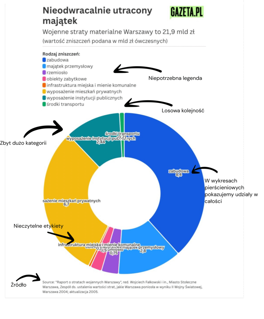 Większość problemów tej wizualizacji wynika z kontrowersyjnej decyzji użycia wykresu pierścieniowego (donut chart). Podobnie jak wykres kołowy, najlepiej sprawdza się on w przypadku pokazania udziałów konkretnej wartości w całości. Donut chart źle radzi sobie również w przypadku licznych kategorii – ciężko porównać ze sobą aż osiem wycinków. Konsekwencją zbyt dużej liczby kategorii są nieczytelne etykiety. Dodajmy jeszcze do tego nieuporządkowane malejąco wartości i mamy przepis na mocno konfundującą grafikę.