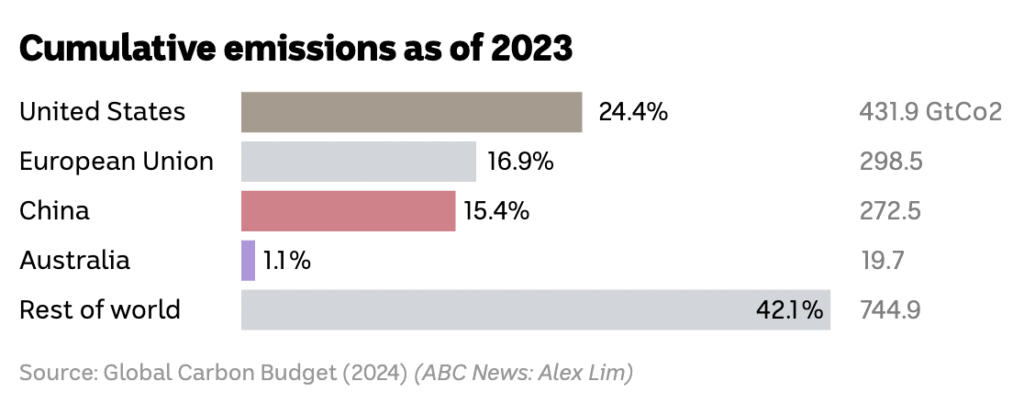 Na wykresie skumulowanej emisji powyżej zastosowano ciekawy zabieg, polegający na umieszczeniu reszty świata na samym dole wykresu. Dzięki temu możemy skupić się na opowiadanej historii, a jednocześnie nie tracimy szerokiej perspektywy, która pozwala nam umieścić emisje poszczególnych państw w kontekście globalnym.